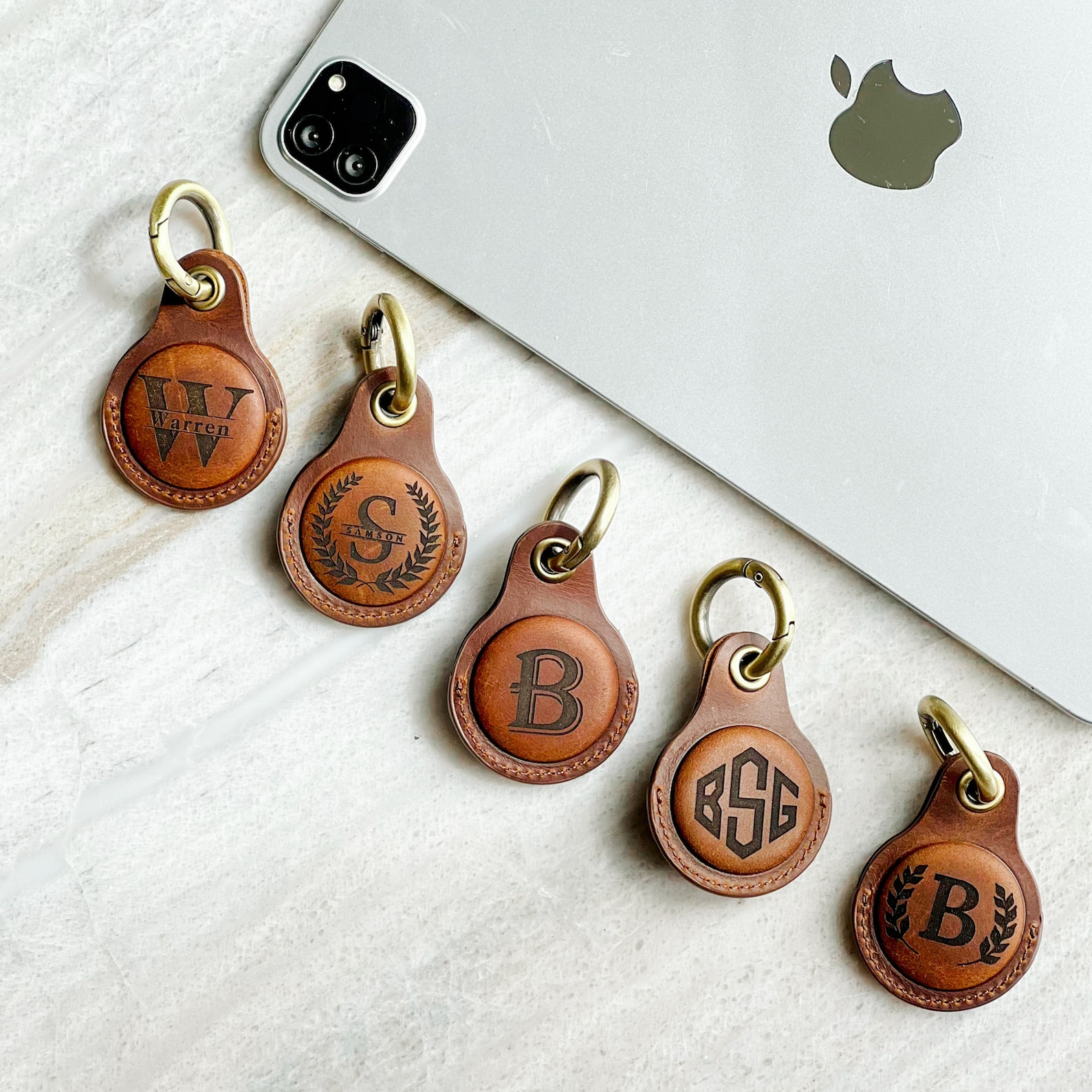 MicBG Personalized Leather AirTag Keychain, $, available at Etsy