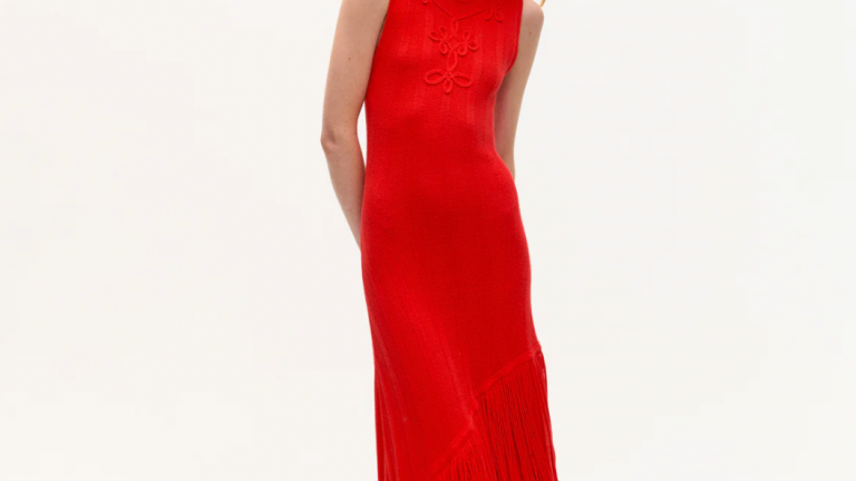 Carolina K‘s Lima Dress is for the one who isn’t afraid of statement-making red. The sleeveless, floor-length knit dress by the Argentine-Bolivian designer features soutache embroidery at the neckline and a diagonal fringe detail across the skirt. It provides the perfect mix of elegance and fun for any office holiday party.