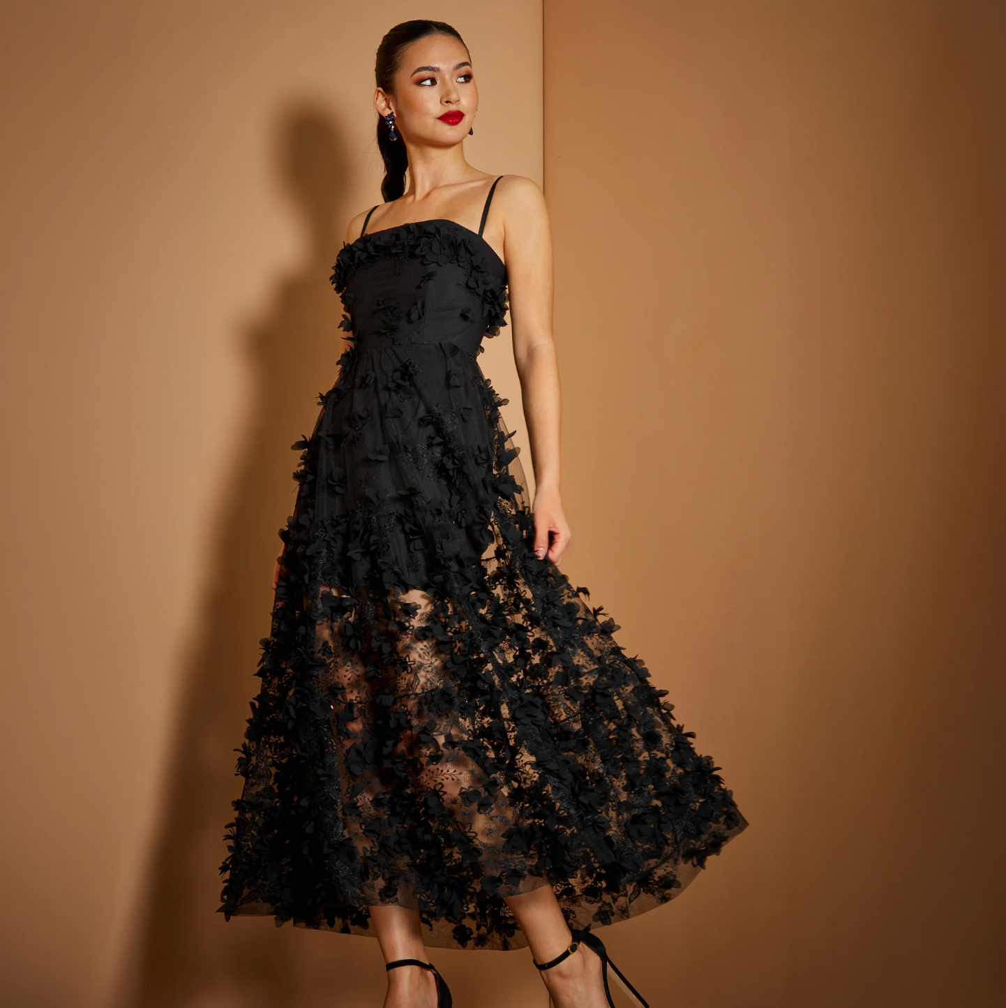 Sometimes, the most glamorous holiday look is a slicked ponytail, red lipstick, and a dress that commands attention. Helsi’s Audrey is that dress. This all-black maxi features a fitted, structured bodice and a classically flared skirt. Whether you wear the adjustable piece with straps or without, eyes will still be on the floral-embroidered mesh fabric that bares just enough leg. It’s perfect for any holiday soirée.
