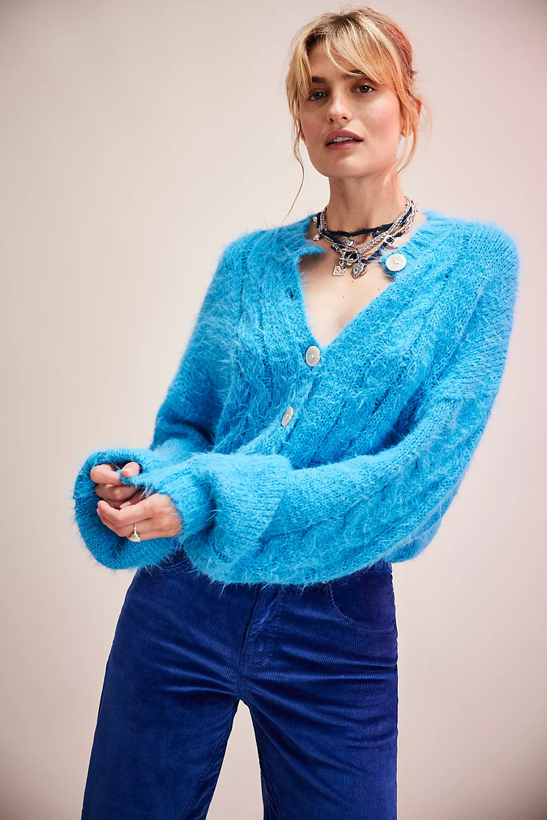 Look absolutely darling in this under-$50 baby blue cable-knit cardi.