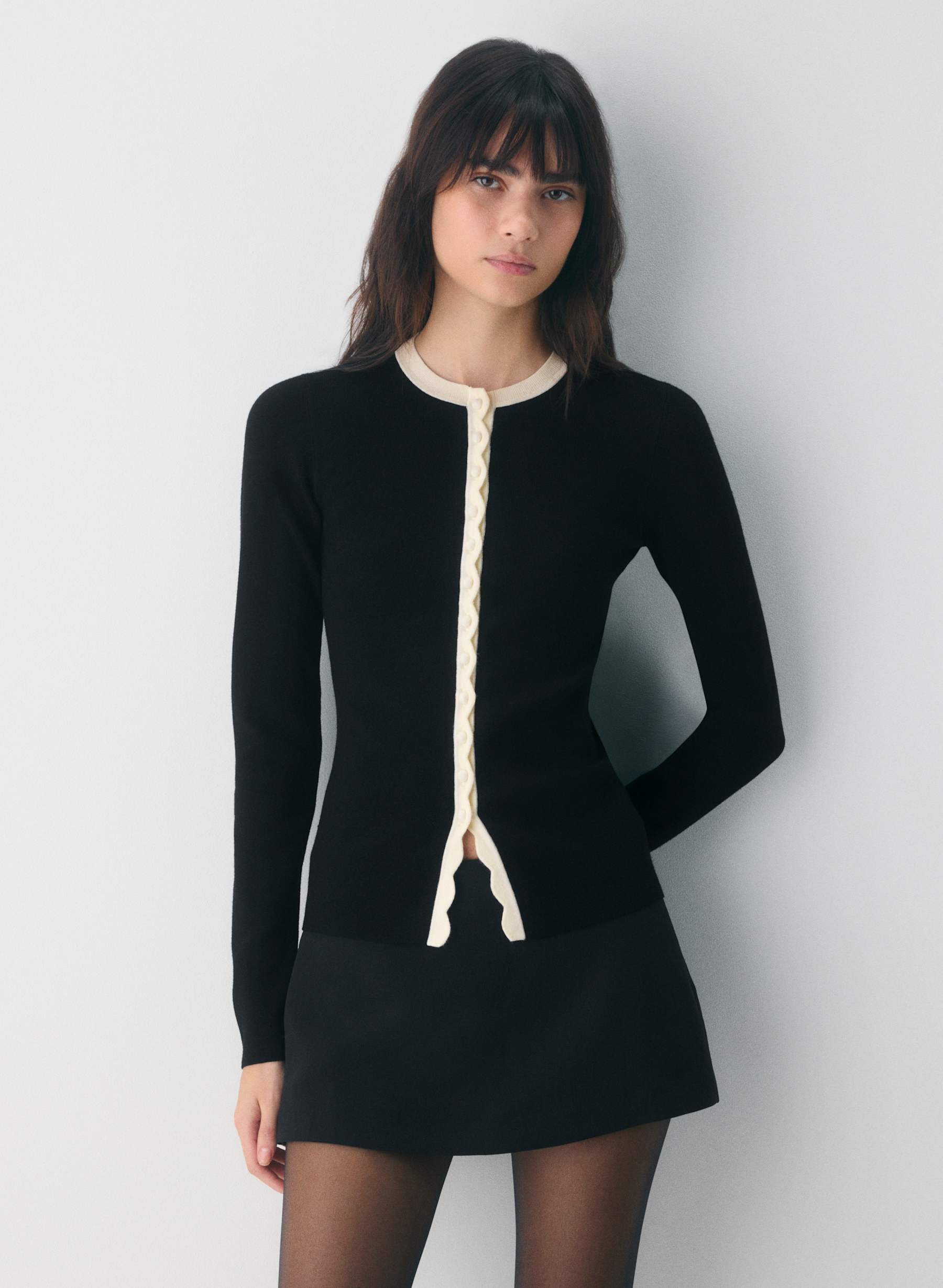 We love a tie-front moment. The fun contrasting trim on this elegant cardigan will elevate an everyday outfit.